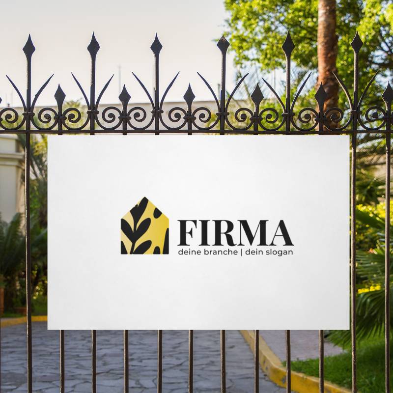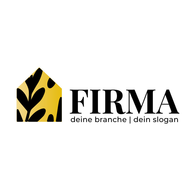 Dieses außergewöhnliche Logo kombiniert die klassische Hausform mit einem stilisierten, schwarzen Blattmuster auf gelbem Hintergrund. Die Verbindung von Natur und Architektur verleiht dem Design eine kreative, lebendige und nachhaltige Ausstrahlung. Die starke, elegante Serifenschrift sorgt für einen hochwertigen, professionellen Auftritt und schafft einen ansprechenden Kontrast zum verspielten Muster des Symbols.